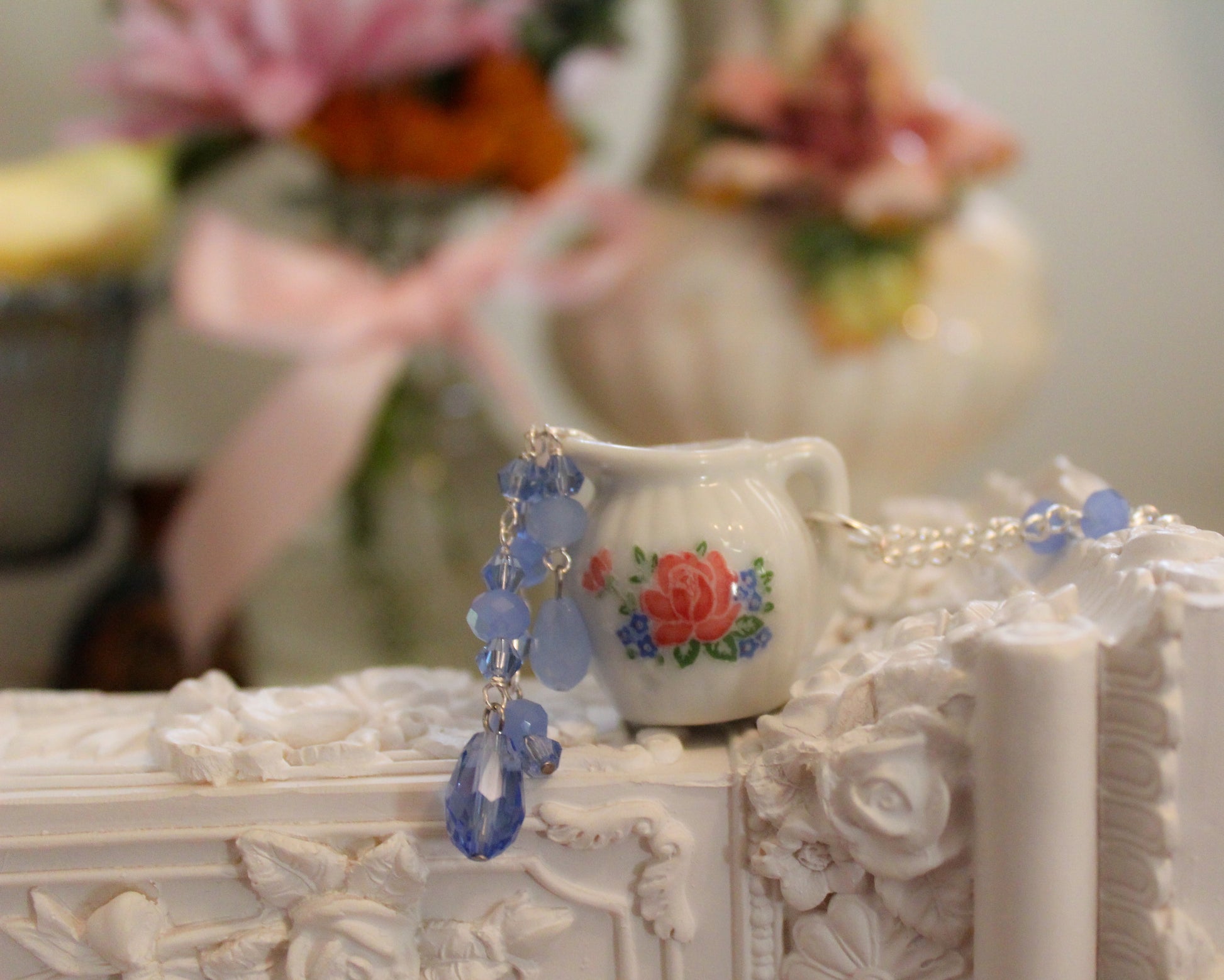 A unique jewelry piece handmade from a vintage mini teapot with sparkling glass beads pouring out the spout. The chain is made with glass beads, a silver plated stainless steel chain, and a stainless steel clasp. Adjustable from 20 - 22.5 inches.
